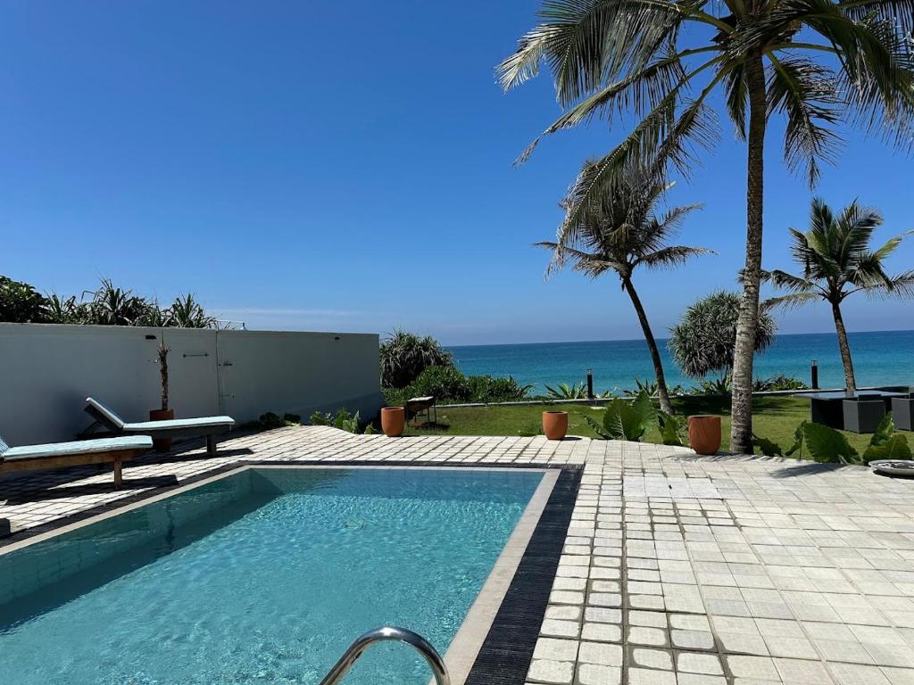 The property is a stunning beachfront property in Induruwa, offering direct access to a private beach area. Guests can unwind by the swimming pool with breathtaking ocean views, relax on the sun terrace, or enjoy various water sports. The property is surrounded by a beautifully maintained garden, creating a peaceful and serene atmosphere.