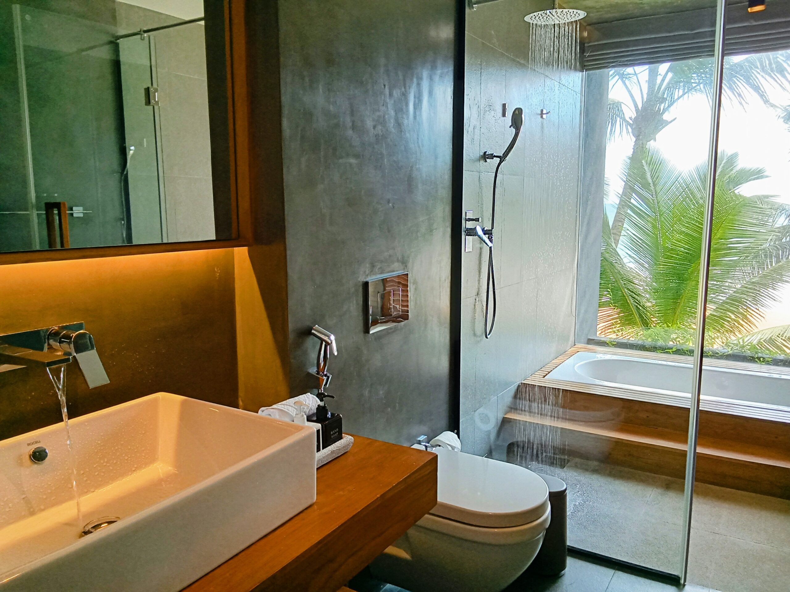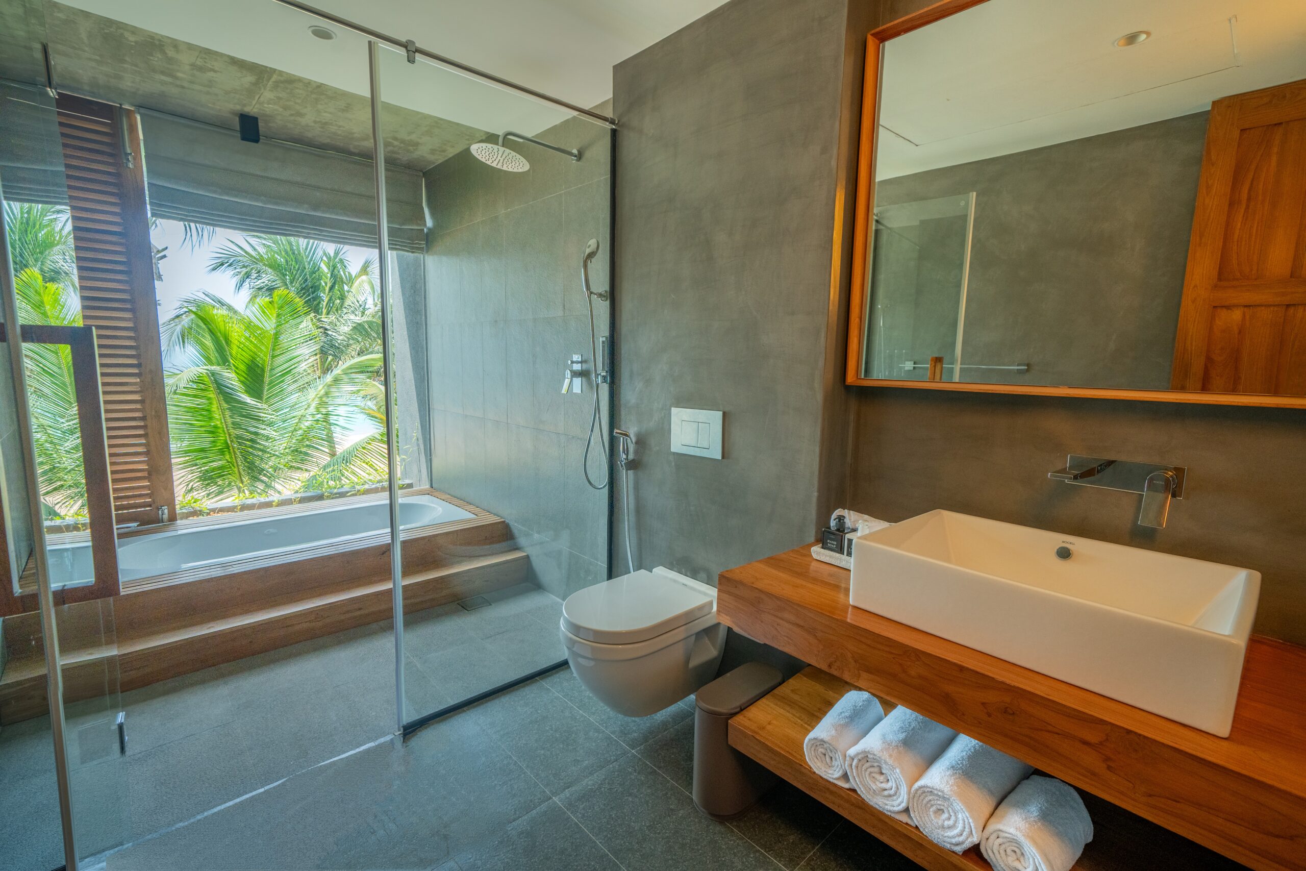Accommodation includes four master suites with pool, garden, or beach views, and one triple suite, perfect for a family with a child or a group of three. Three bathrooms feature bathtubs overlooking the beach, while another offers a unique indoor/outdoor shower experience.